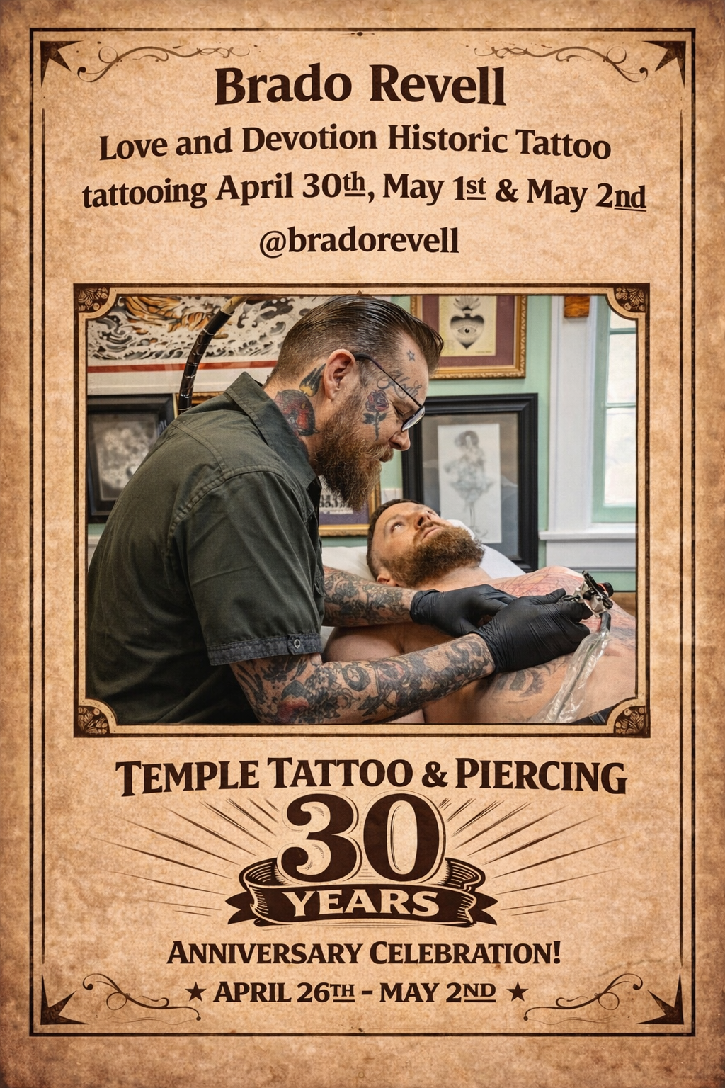 Brado is joining us from Love and Devotion Historic Tattoo in Ratcliff, KY—a legendary space that has been home to tattooing since the 1970s, first to Ray Smith and then Renegade for many years. True tattoo history runs through those walls, and we’re honored to have him be part of this week.